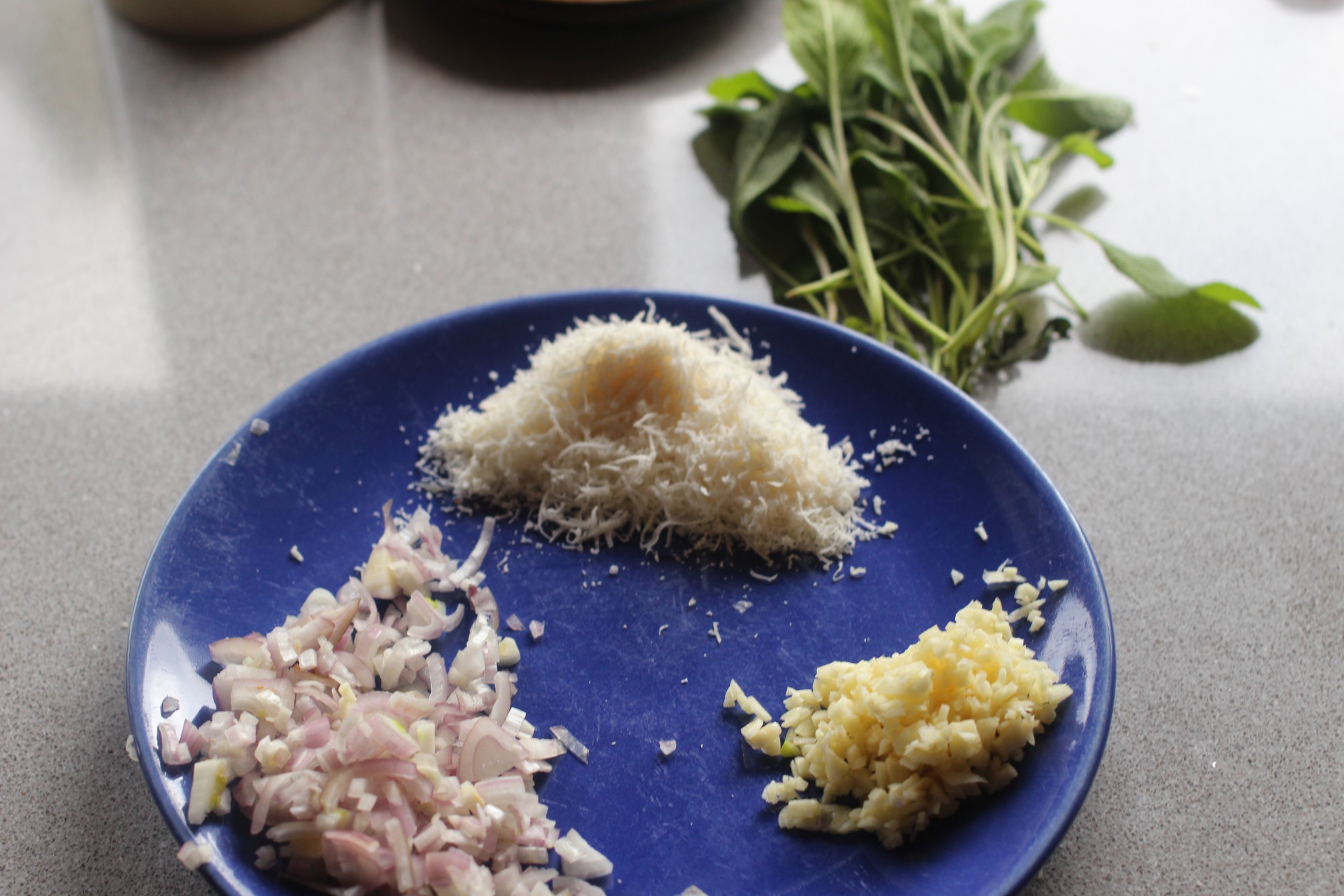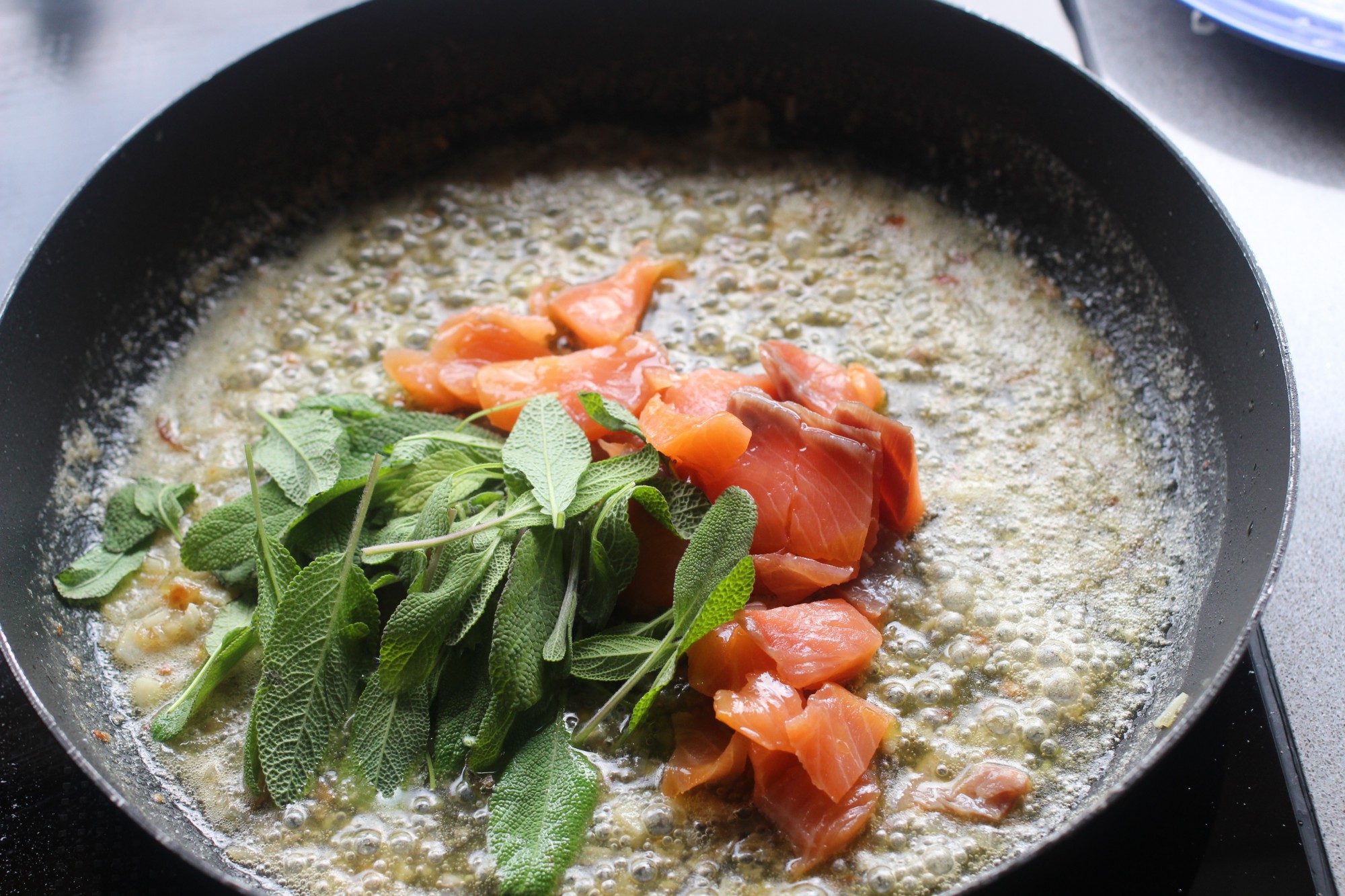 - Gjør klar ca 100 g røykelaks per person i litt grove skiver som deles opp. Gjør også klart en liten neve med salvie per person. Dette skal oppi sausen helt til slutt. Rasp rikelig med parmesan – både til bordet – og en ss som skal blandes i sausen.