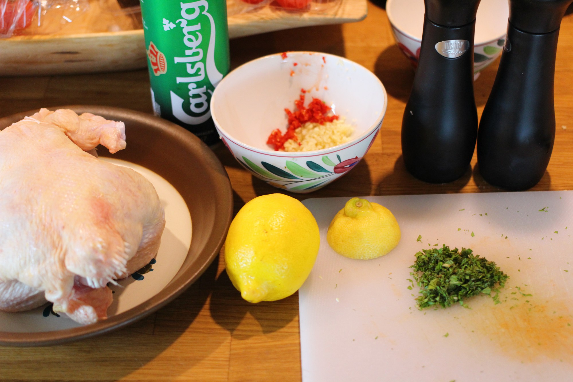 - Så et clouet å klargjøre en halvfull ølboks: hakk litt mer åpning i toppen med en kniv og putt nedi urter som du har og ev litt løk/hvitløk, men behold topplokket – det stabiliserer boksen når kyllingen nå tres over. Så tetter du halsåpningen på kyllingen med sitronskalken.
