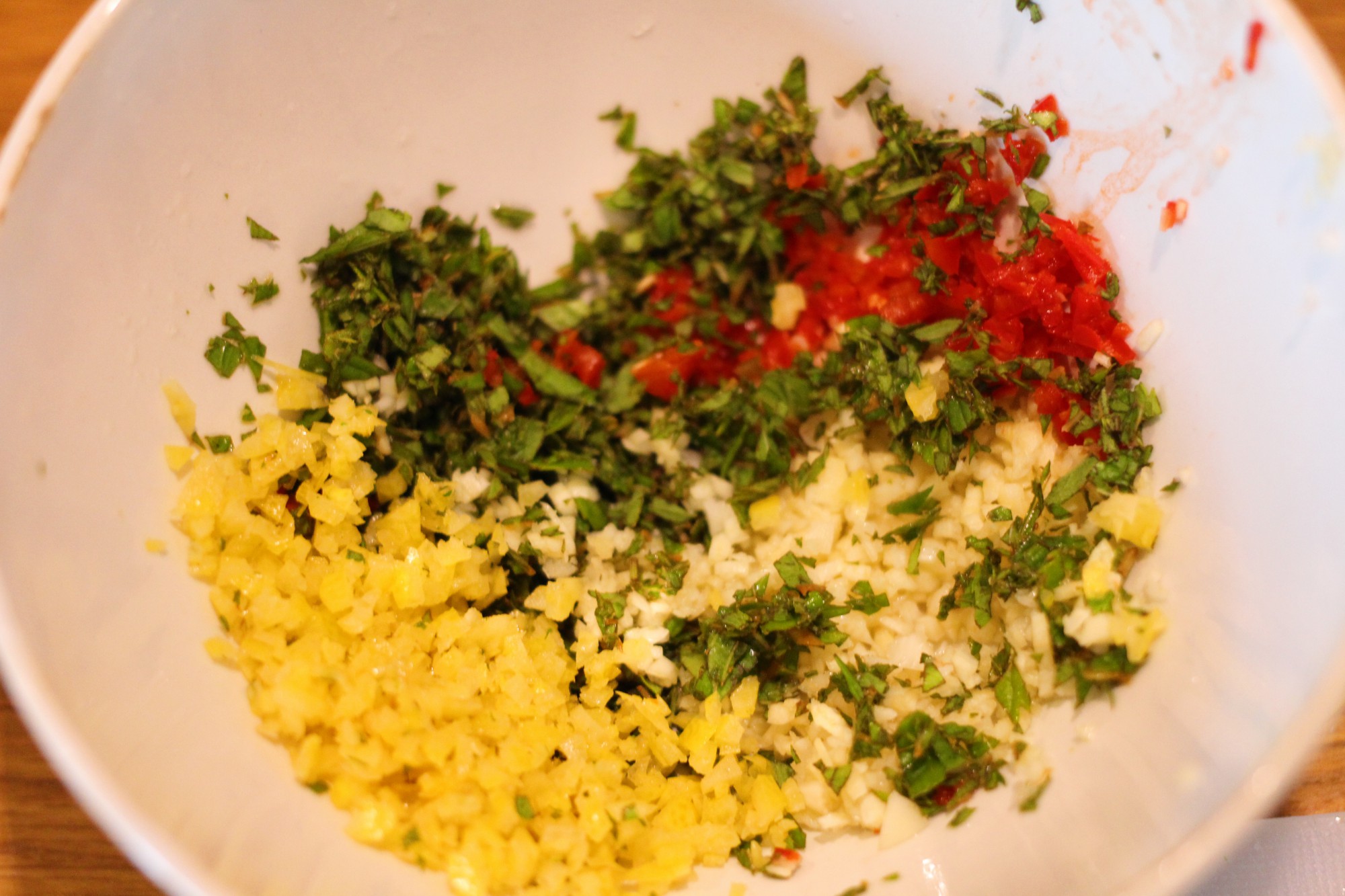 - Start med å lage rikelig dressing som smøres på kyllingen – og jeg fører også et par skjeer inn i kyllingen og fordeler: for en kylling: 3 fed hvitløk og 1/3 rød chili som hakkes, i tillegg hakkes grønt, jeg bruker peppermynte som jeg har mengder av på Hestøya. Skjær også det gule ytterste skallet