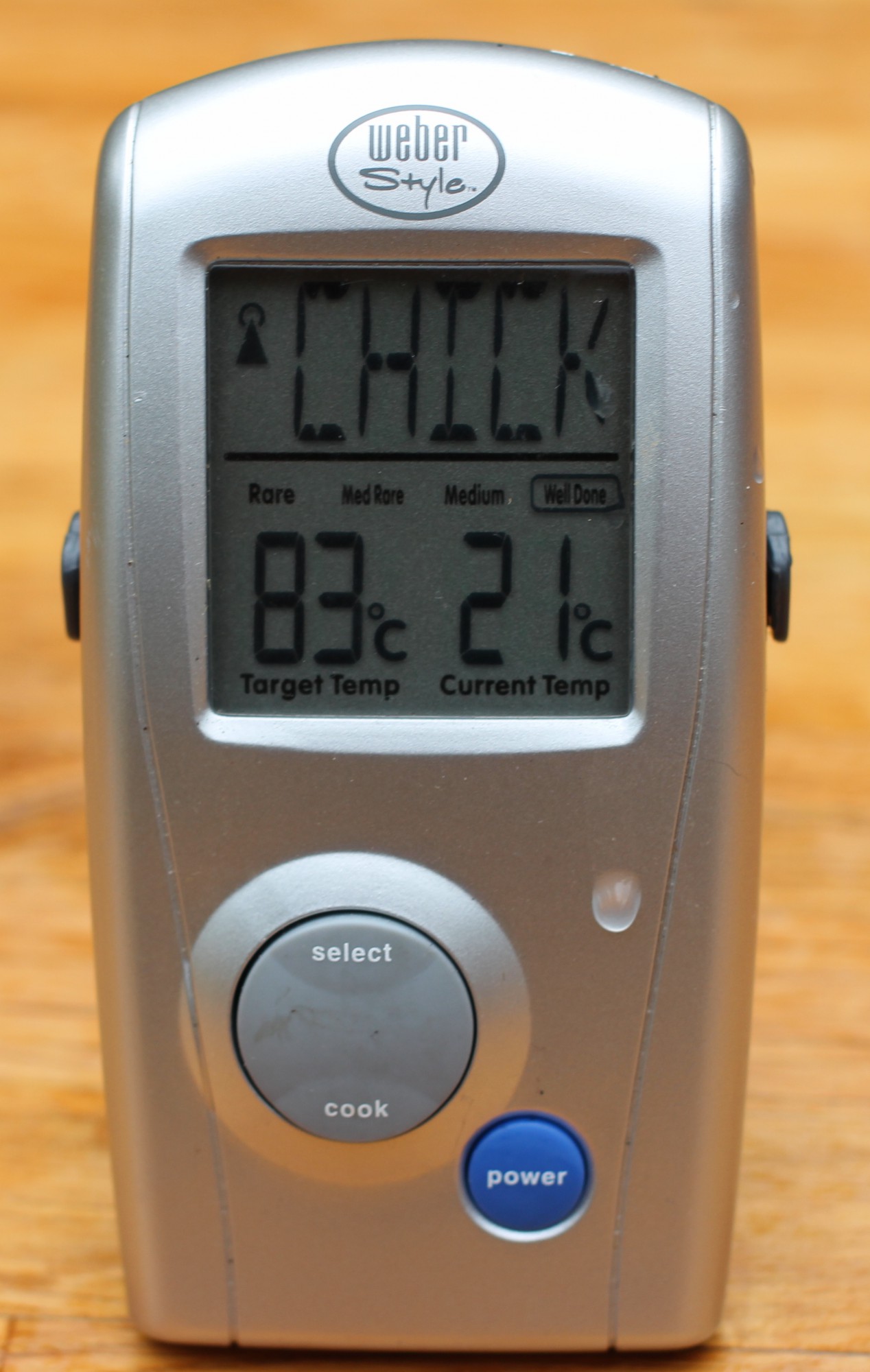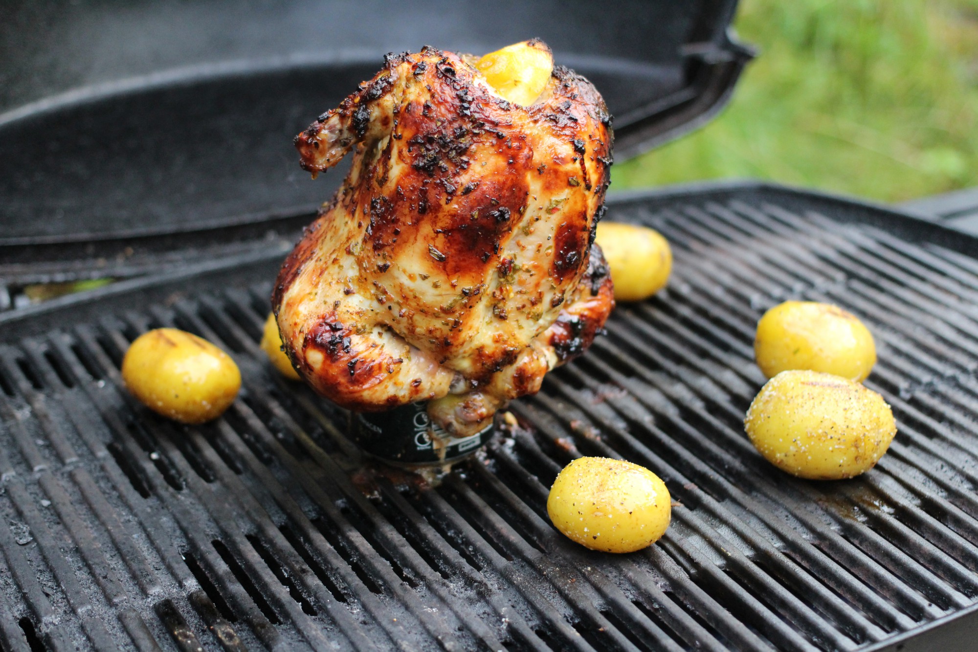 settes i grillen på indirekte og lav varme, grillen må ha lokk. Har du termometer på grillen så prøv og hold deg på 150-180 grader. Grilltida er litt etter størrelsen på kyllingen, men opp mot en time bør du regne. Har du steketermometer så la det gå til vel 70 grader – mitt Webertermometer foreslår automatisk 83 grader når jeg stiller inn på kylling….