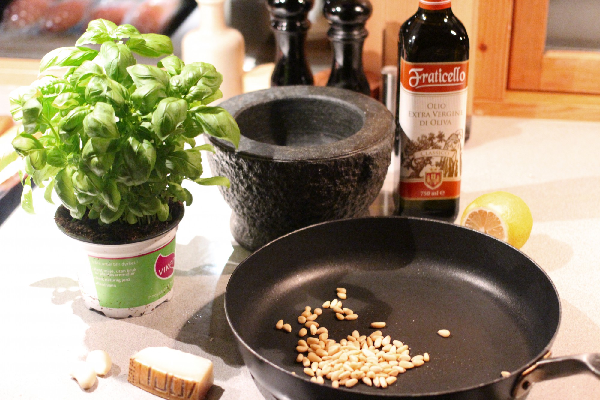 har jo mange ferdige varianter, men du lager den kjapt selv til omtrent samme prisen. Har du ei fin potte med basilikum, er det gjort på ti minutter, bruk en stor steinmorter: