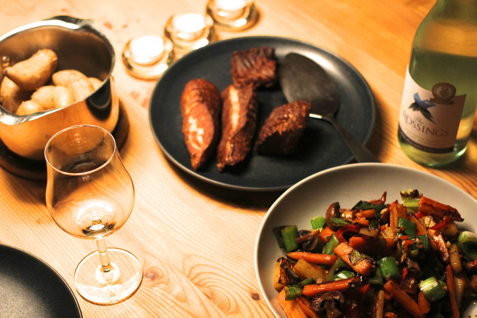 Mens røykinga pågår kokes mandelpotet og grønnsaker surres i panne med rikelig soyaolje, ta det du har, her er det gulrot, kålrot, paporika, purre og aromasopp. Når det er bra stekt slår du ned varmen, skyv plass i panna og ha på 1-2 ss olivenolje hvor et par fed hvitløk får surres lett før du salter/peprer og blander alt sammen.- Etter 15 minutt slår du av induksjonen og åpner ventilen for røyken. La stå i 5 minutt til. Da er fisken klar.