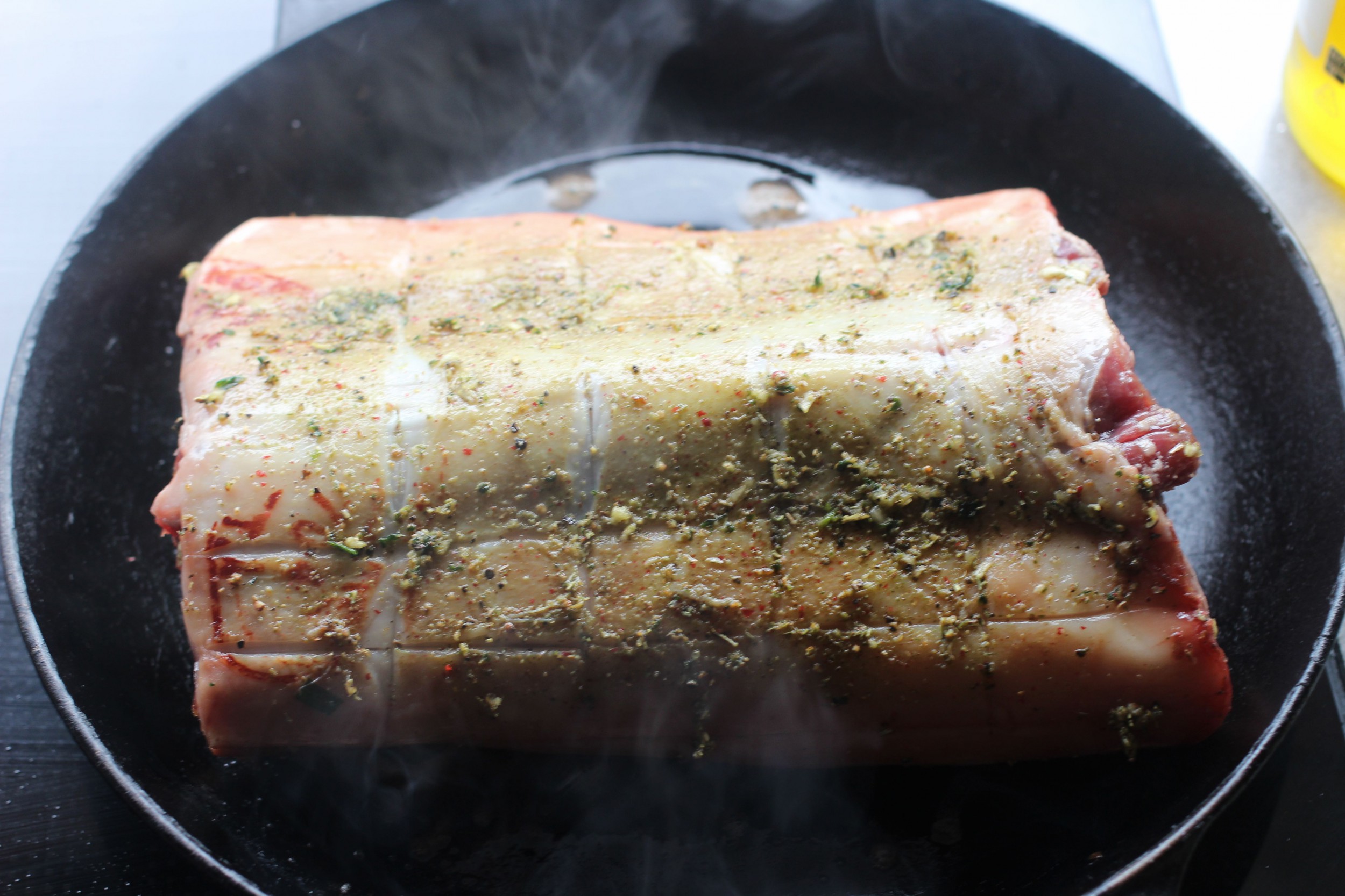 - Rut opp skinnet på sadelen og gni inn med krydderblandingen. La stå minimum en halv time.
