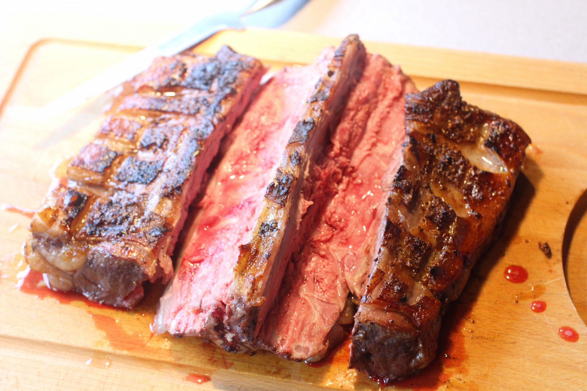 en smal kniv følge beinene – ikke glem indrefiletene på undersiden! Skjær i 1-2 cm skiver og legg tilbake i beinet for servering – lekkert! Og kjeet skuffer ikke – saftig lyst kjøtt med fin smak.