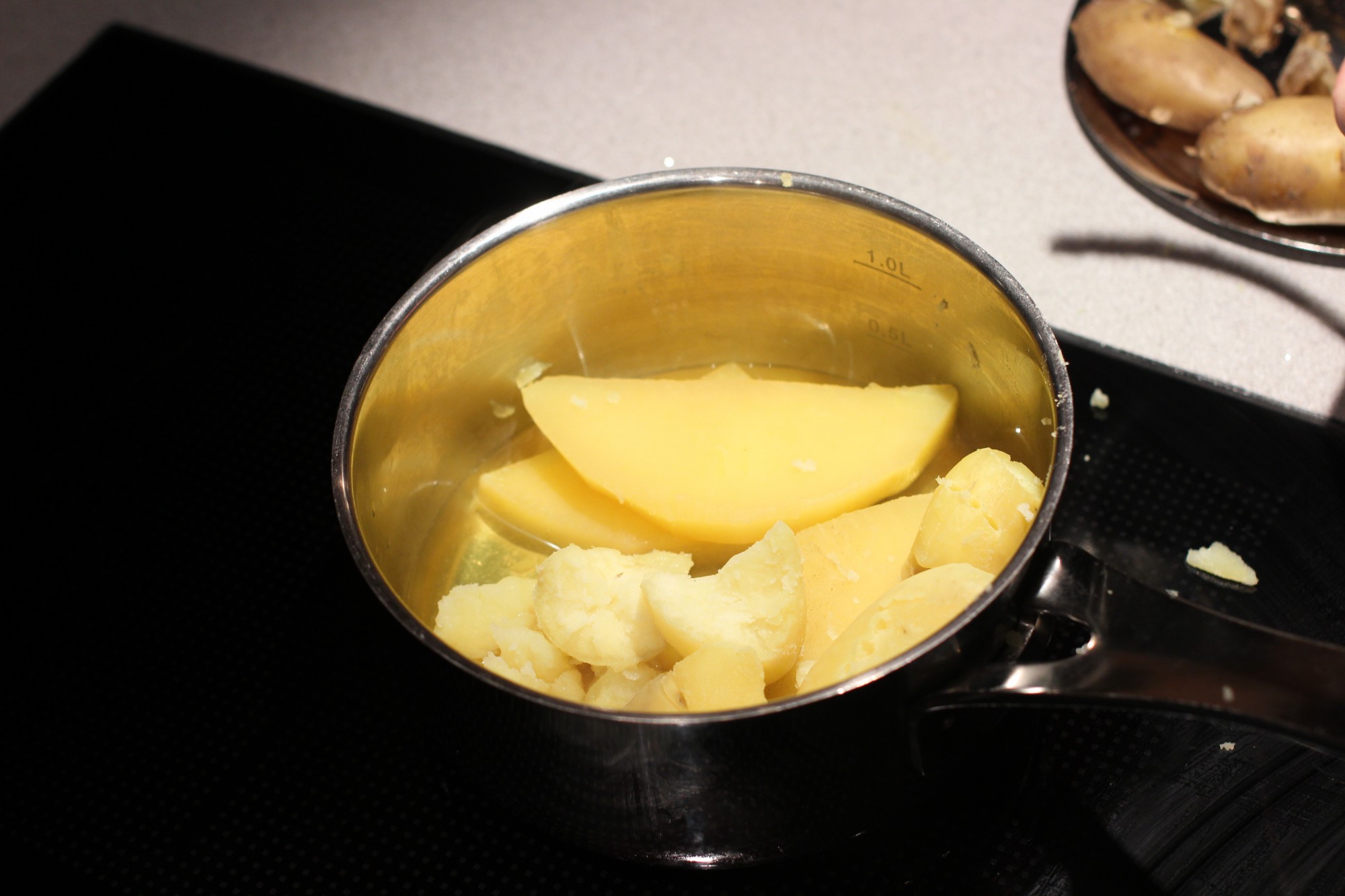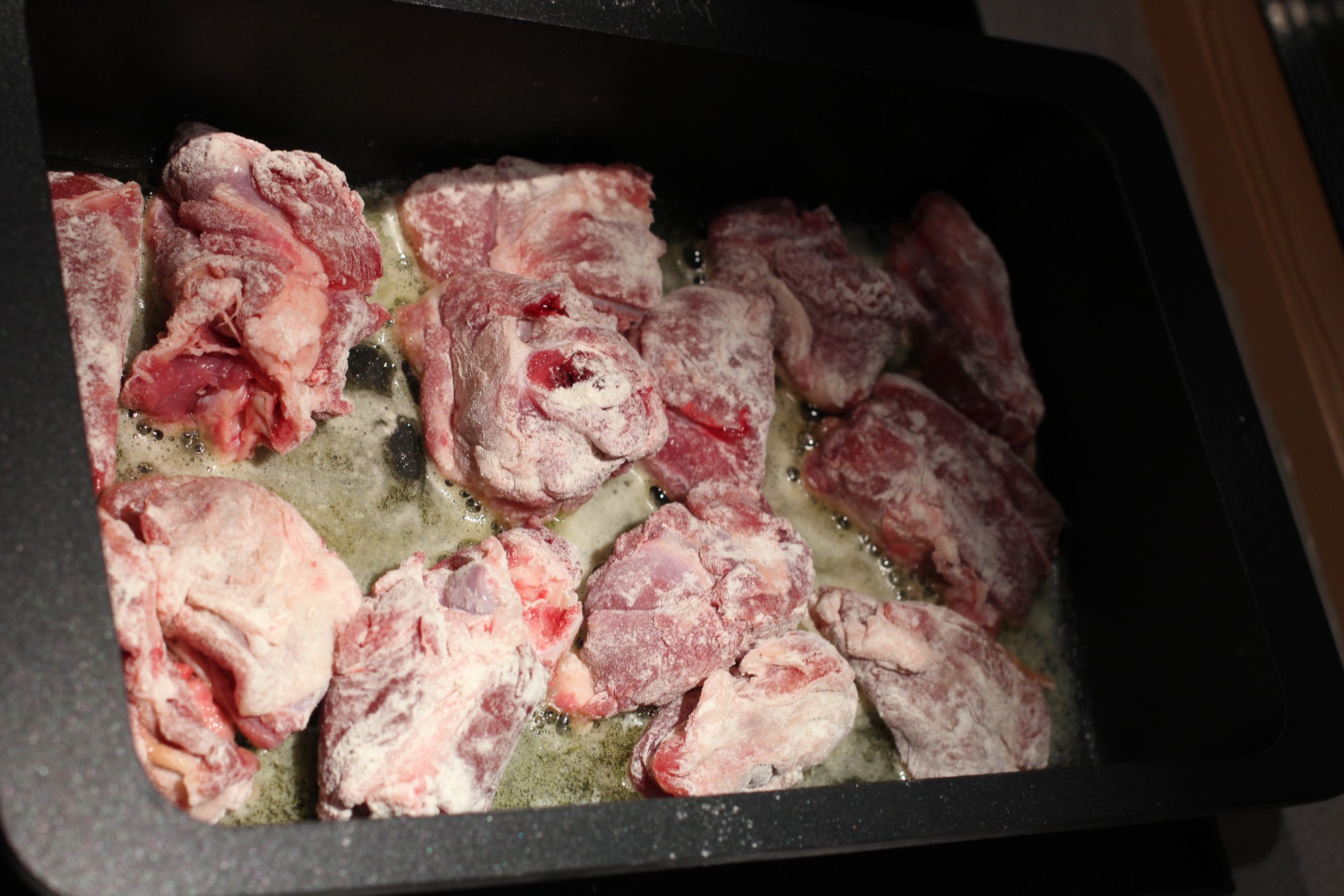 Deler opp lammebogen, ca 1,3 kg i passelige biter, bruk kjøttøks og sag, kjøttet vendes i hvetemel blandet med rikelig pepper og salt.- Stek kjøttet i panne/gryte med 2 ss smør og 1 ss rapsolje som tåler steking.