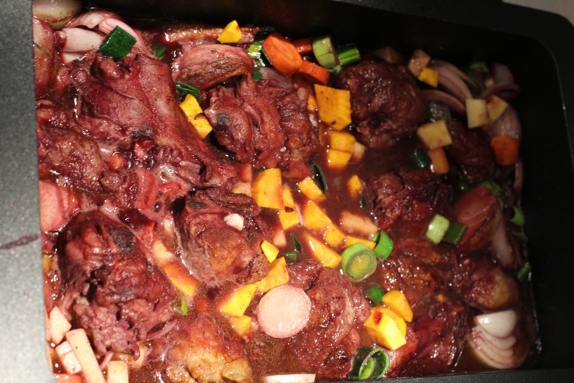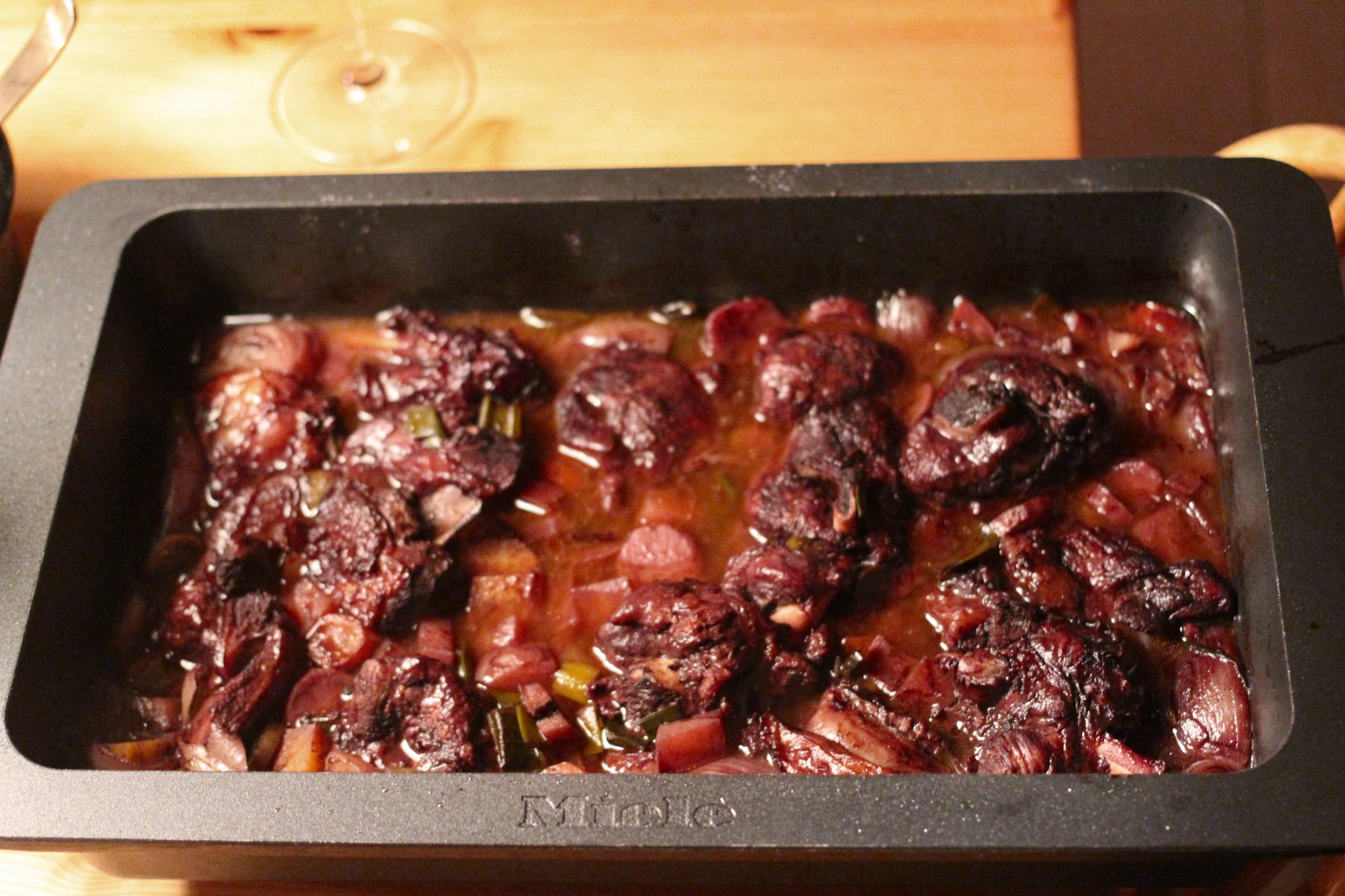 - Sørg nå for at alt er i ei gryte med lokk som kan inn i ovnen. Fyll på en flaske rødvin – nå trenger du ikke gå til de beste hyllene i vinskapet…. jeg brukte en portugiser til ca 100 kr: Escada. Ha i en ts pepperkorn, 2-3 nellikspiker og et laurbærblad. La det koke opp, så setter du gryta med lokk i stekovnen med over/undervarme 150 grader. La det stå tre timer, da er alt klart til