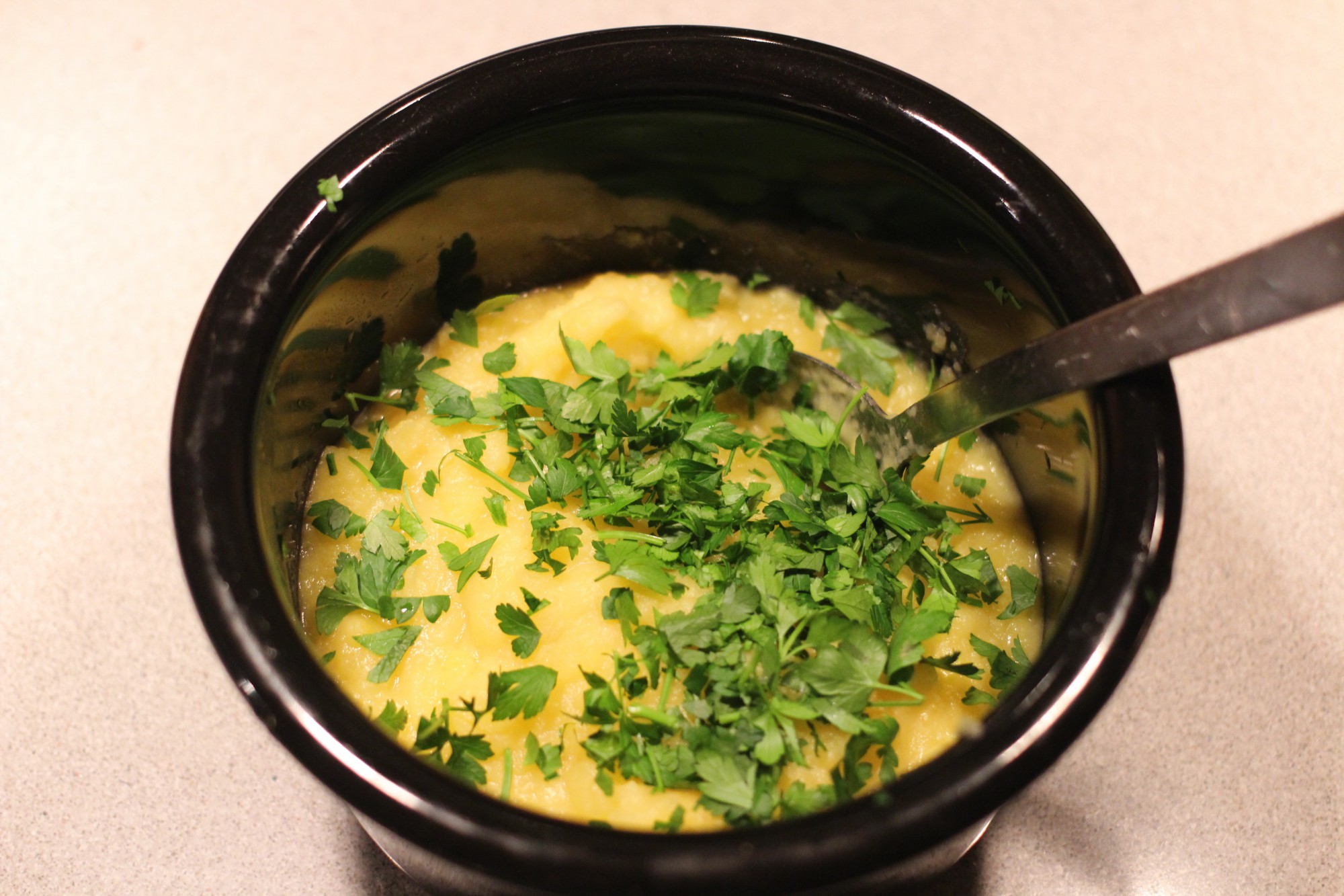 servering – smak på krafta og reguler eventuelt med salt og pepper, ev kok ned litt hvis sausen er for tynn. - Her passer det godt med en rotmos, mørkok potet og røtter, jeg har kålrot og persillerot denne gangen. Moses sammen med rikelig med smør og litt av kokevannet, smak til med salt og pepper. Persille eller timian på toppen – ta det du har.