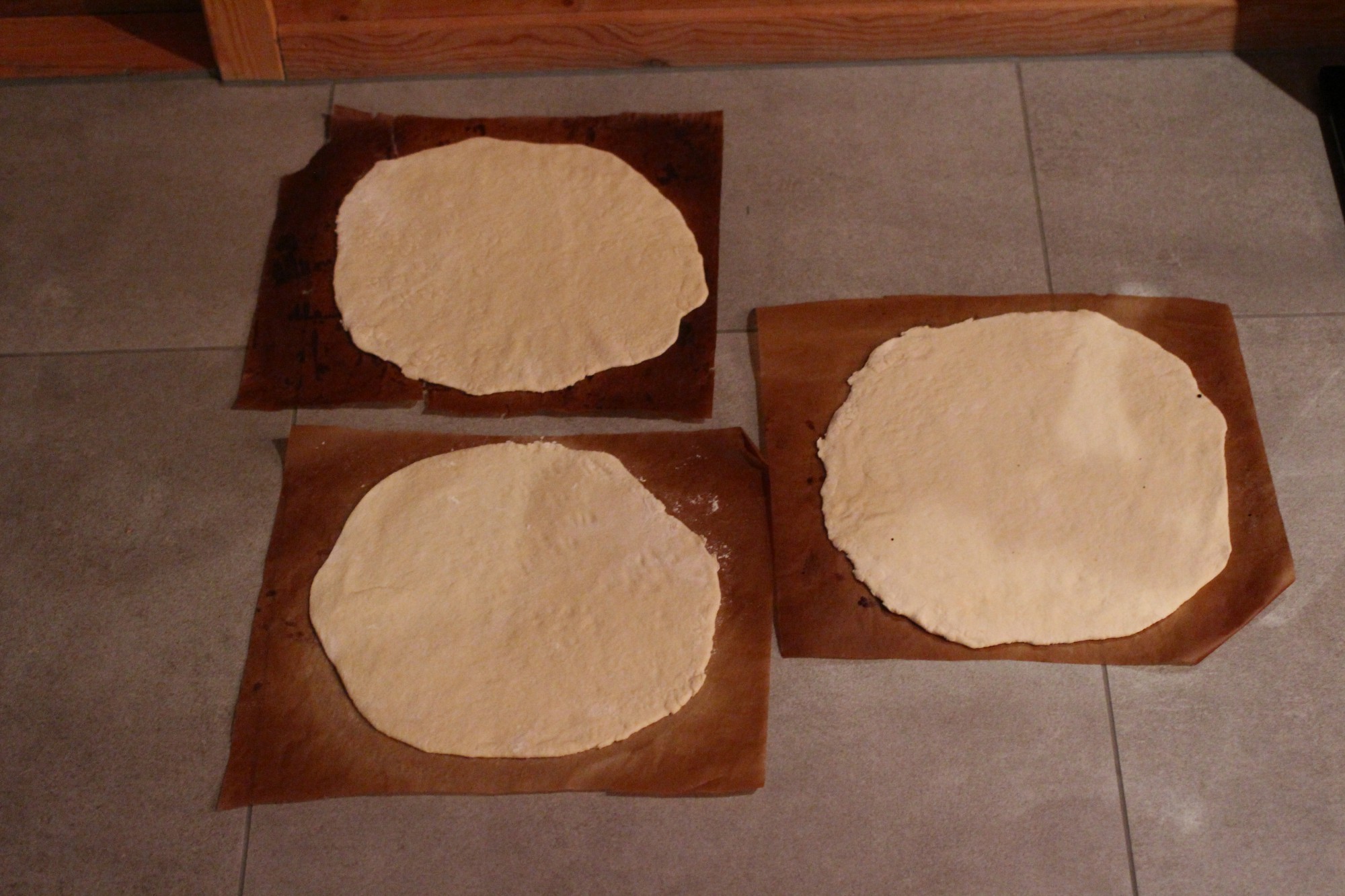 startet med). Press ut hver del til en mest mulig rund leiv, så fortsetter du med kjevle til du får en tynn rund bunn. Fortsett å bruke litt mel om nødvendig, så løfter du forsiktig bunnene over på et bakepapir, da kan du flytte dem lett med en pizzaspade uten at det klistrer. La bunnene hvile på en lun plass – hva har vi gulvvarme til hvis det ikke er til dette, bakepapiret gjør at det er helt renslig! Jeg har hatt opptil seks pizzabunner samtidig utover gulvet. - Nå må du sette på stekovnen på høy varme, minst en halvtime før stekingen starter. Bruker 250 grader over/undervarme. Jeg har en pizzastein og anbefaler det sterkt. Legg den på rista i ovnen langt ned i ovnsrommet.