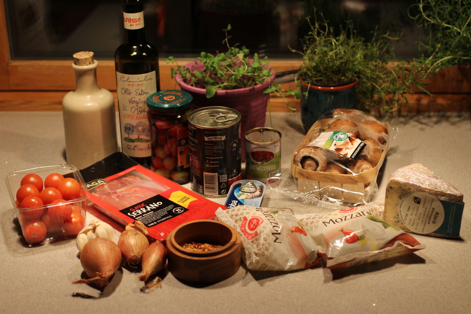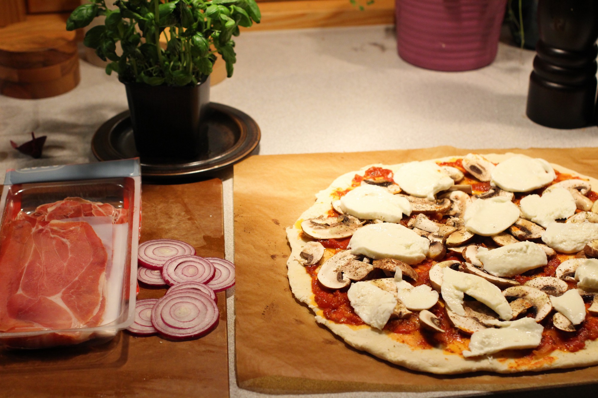parmaskinke. Her er det bare sausen og aromasoppen sammen med en fersk mozzerella som skal inn i ovnen, dette gjør du klart mens ansjospizzaen stekes, samtidig skjærer du opp noen skiver rødløk som ligger klart sammen med skiver med parmaskinke og basilikum. Når pizzaen kommer ut av ovnen fordeles først rødløken, så skinke og topping med basilikum.