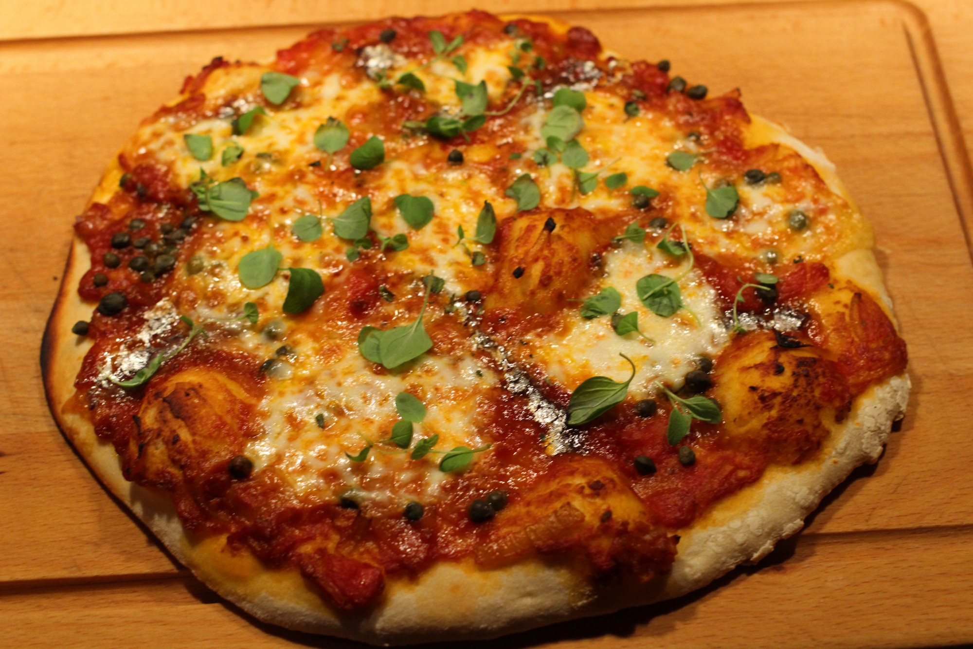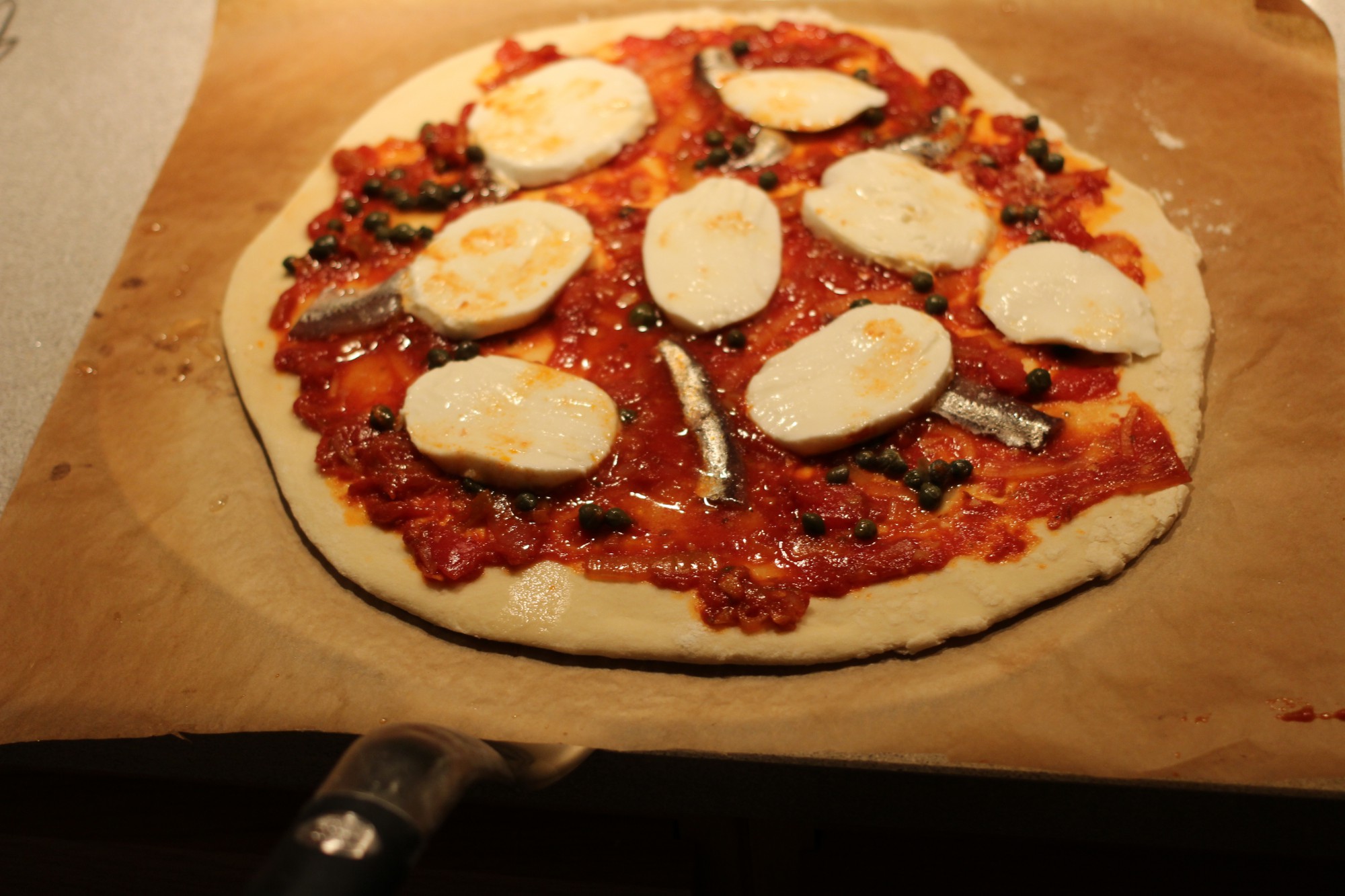 tomatsaus, så leggges 8-10 ansjosfileter utover sammen med 4-6 ts kapers, fordel en fersk Mozzerella i tynne skiver utover, har du ikke fersk, går revet ost greit nok. (En litt annen pizzavariant med anjos finner du her). Alle pizzaene har jeg 10 minutt inne i ovnen, når du tar dem ut, tar du spaden mellom papiret og bunnen, er bunnen vellykket får du fine bobler, som i Italia. Når pizzaen er ute av ovnen strør jeg over fersk oregano.