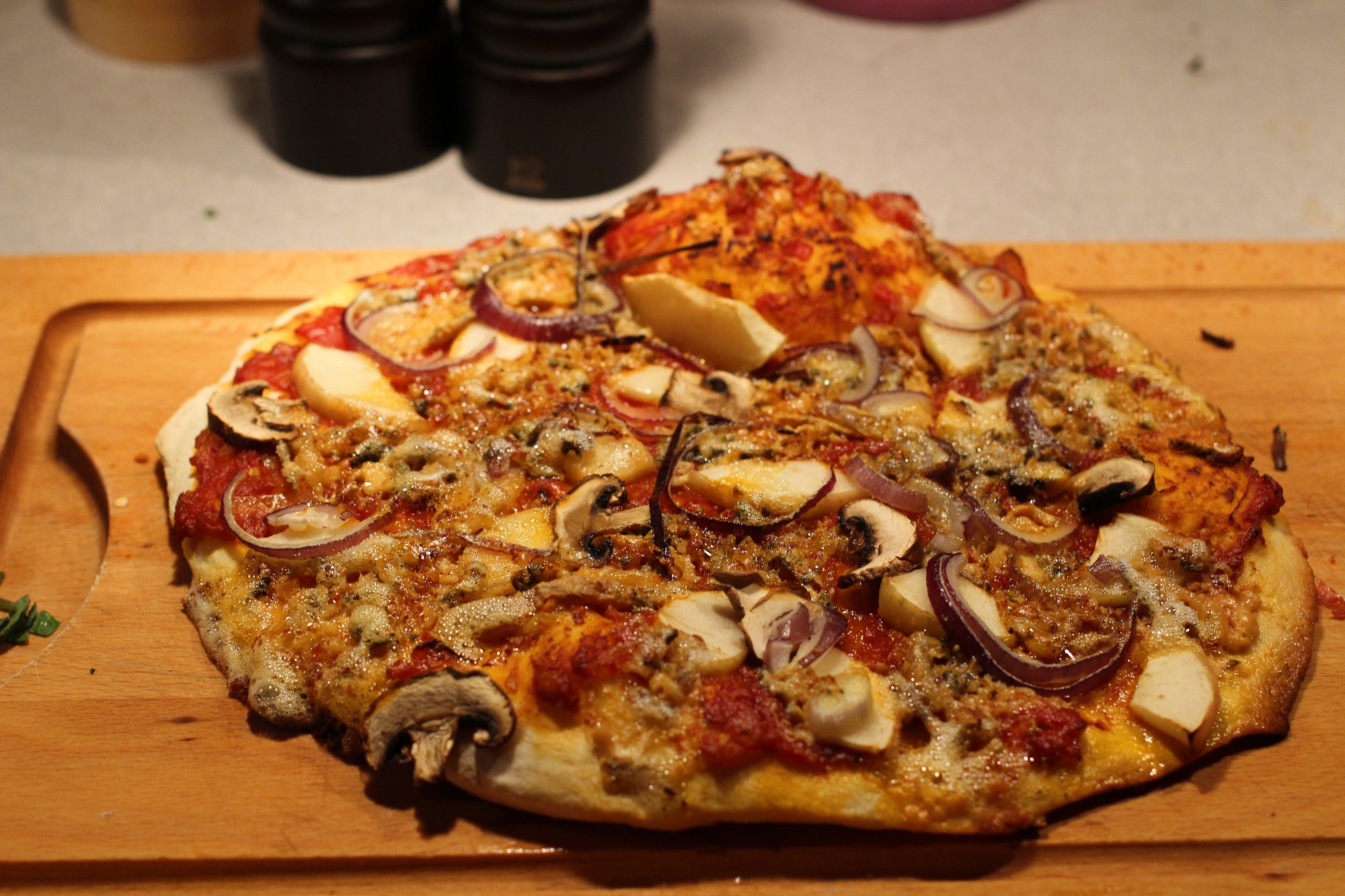 fortært. Denne dagen har jeg tomatsaus og sopp igjen etter de to første pizzaene, så da går det med også på den siste. Supplerer med et halvt eple i skiver og nå tar jeg med rødløkskiver inn i ovnen. Til slutt blåskimmelost – jeg bruker Råblå fra Grindal ysteri, det beste er jo godt nok, men ta det du har. Dette blir en ganske mektig pizza, vil du heller ha den lettere – som en dessert, så er kanskje en pizza jeg har presentert tidligere enda mer egnet: Blå pizza, den aller enkleste. Uansett er det godt å dryppe over litt god olivenolje før servering.