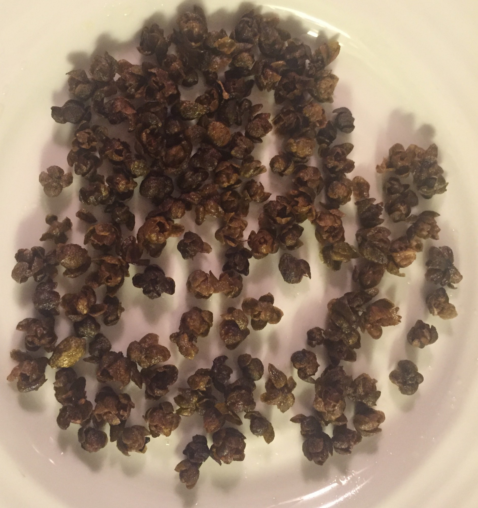 - Kapers hører med, jeg friterer dem denne gangen, da blir det litt krispy salt smak. Varm opp litt solsikkeolje, ca 1 cm opp i en liten kasserolle og varm opp til det er så varmt at det syder rundt ei tresleiv, da kan du ha oppi vel en ts kapers per person, følg med til de endrer fasong (popper opp) da er de fedig og fiskes opp med ei hullsleiv over på et kjøkkenpapir. Strø dem så over tartarene sammen med hakket persille og rødløken som du har hakket opp.