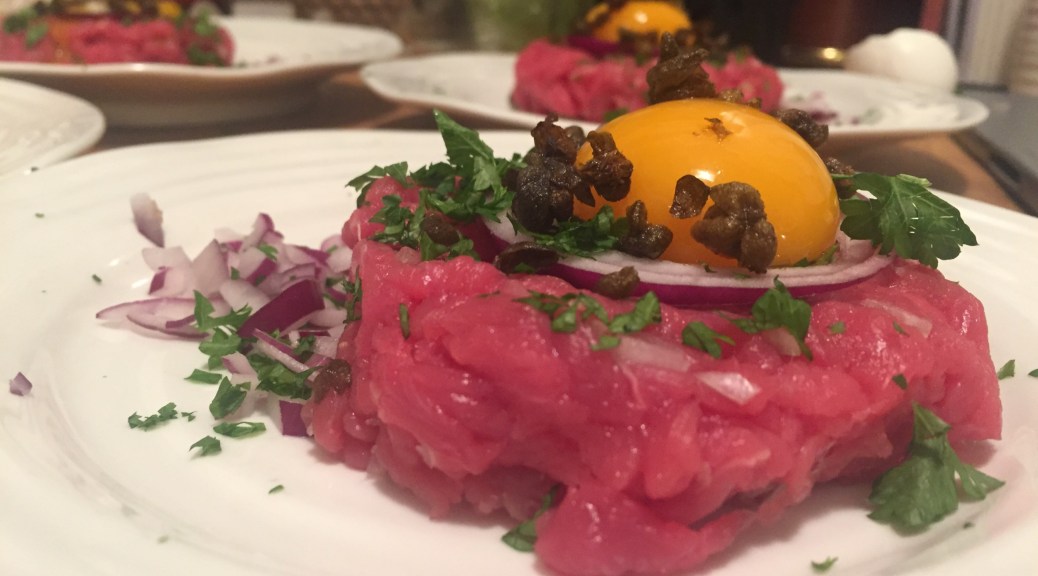 Biff tartar dukker opp fra glemselen som mulig rett med jevne mellomrom. Et høydepunkt med tartar hadde jeg på en «studietur» for noen tiår siden som hadde en av overnattingene på daværende SAS-hotell i Oslo. Mulig jeg må ta hovedskylda for at kvelden etter midnatt en gang endte med biff tartar på roomservice…. Kanskje var vi 8-10 personer inne på et par dobbeltrom. Det var nok en debut med råe ingredienser for de fleste, men opptil flere var enig med meg om at dette er skikkelig godt! Og så er biff tartar jo enkelt og kjapp å tilberede.