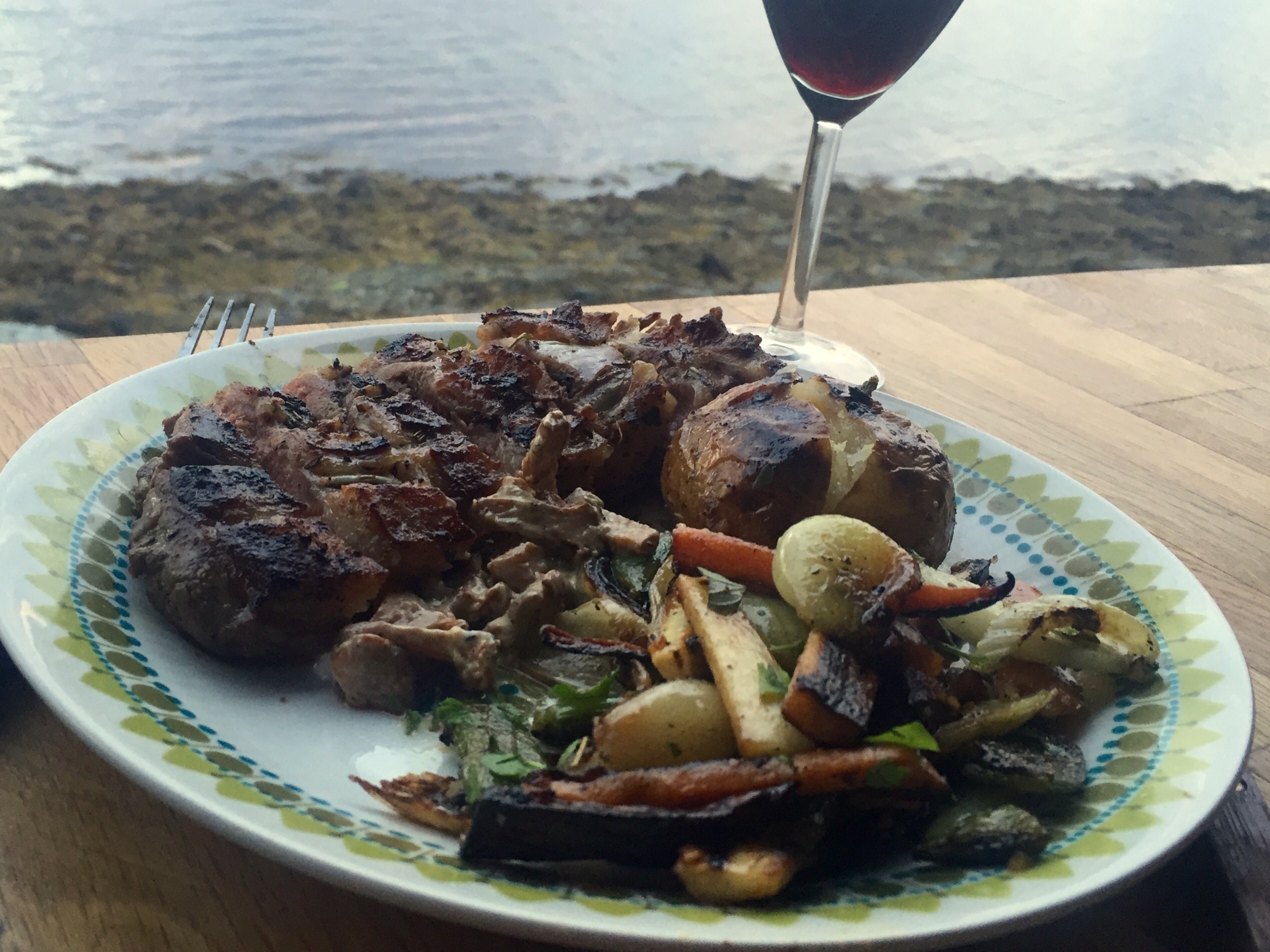 Da er det bare å servere, fileten skjæres i cm-tykke skiver. Dryss litt hakket persille på grønnsakene. Her er måltidet klart, med Trondheimsfjorden som fin bakrunn.