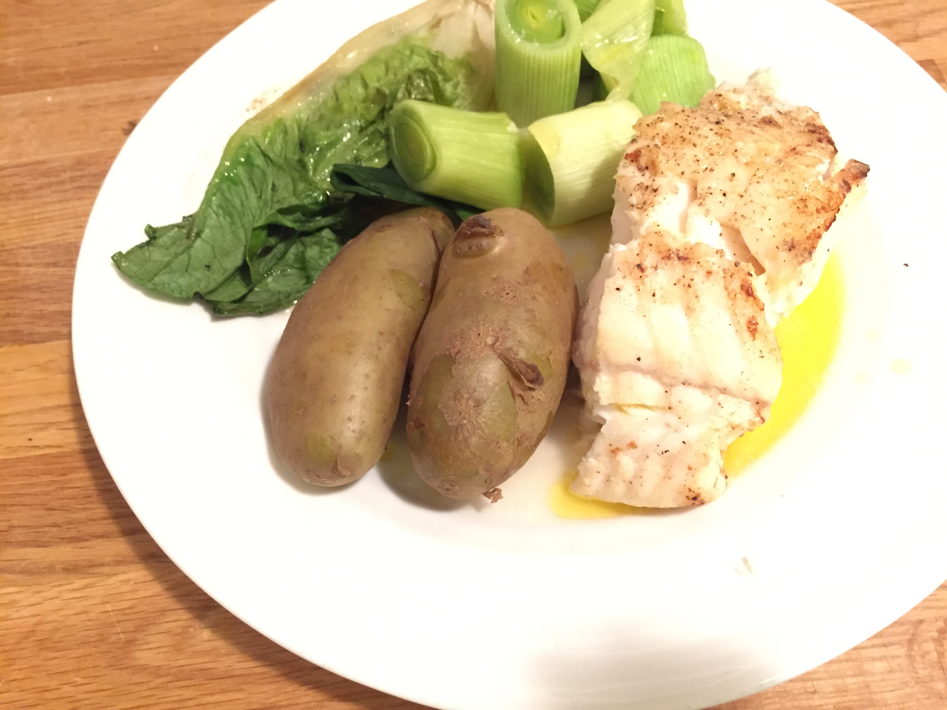 - Siden jeg har så rikelig med fisk, blir det enkelt tilbehør. Mandelpotet, stekt hjertesalat og dampet purre. Del hjertesalaten på langs og stek den på middels varme med snittsiden ned ca 5 minutt.1/2 hjertesalat per person. Strø på litt flaksalt.