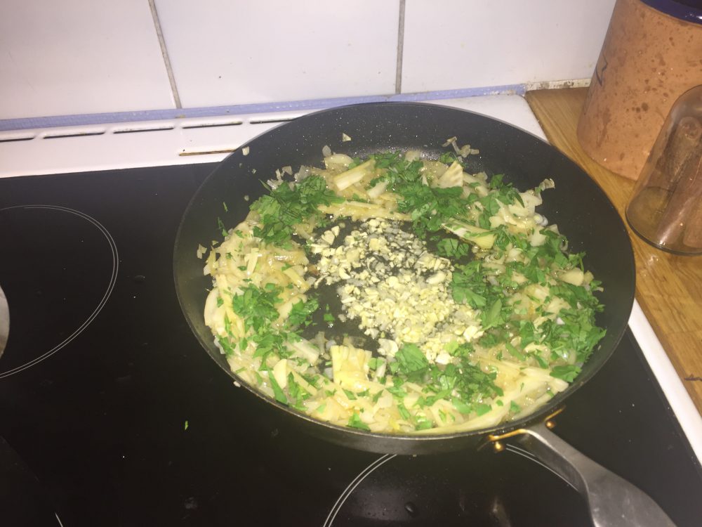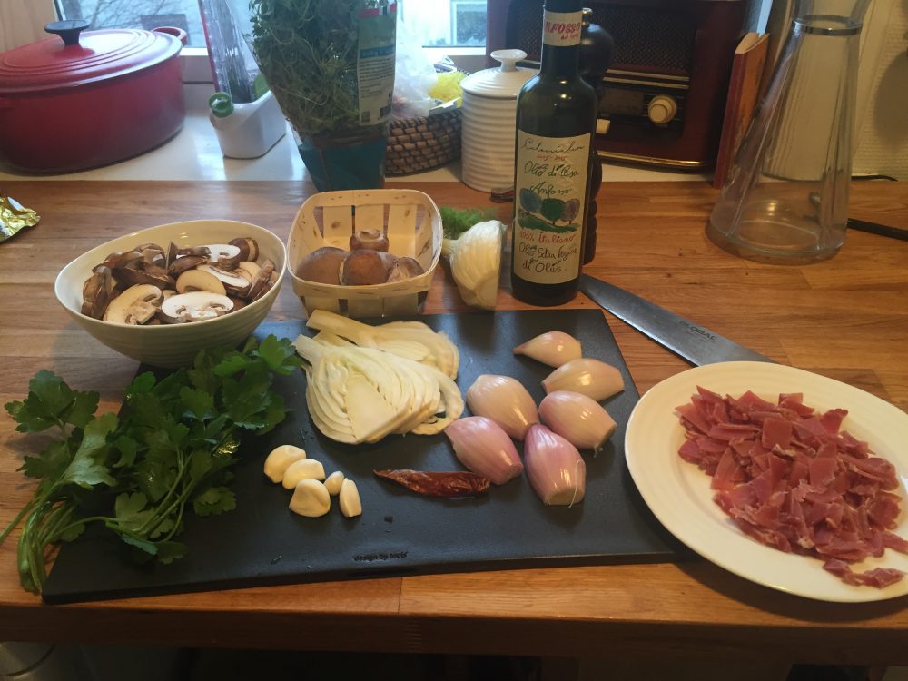 Imens surrer du sjalottløken og fenikkelen i et par ss olivenolje, ikke for kraftig varme, det skal bare bli blankt, slå ned varmen ytterligere, skyv inholdet i panna bort fra midten – der har du i en ytterlig ss olivenolje og så den hakkede hvitløken, som skal bli blank, ha i persillen og bland så alt sammen. Når pastaen er ferdig har du i soppen og spekeskinka slik at alt blir varmt.