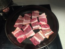 180 g bacon, gjerne litt tykt eller i terninger stekes sprø i panna, ta god tid og ganske lav varme, legges på tørkepapir – brekkes/skjæres i biter hvis det er brukt baconskiver. Her bruker jeg tykke skiver: Gilde skogsbacon.