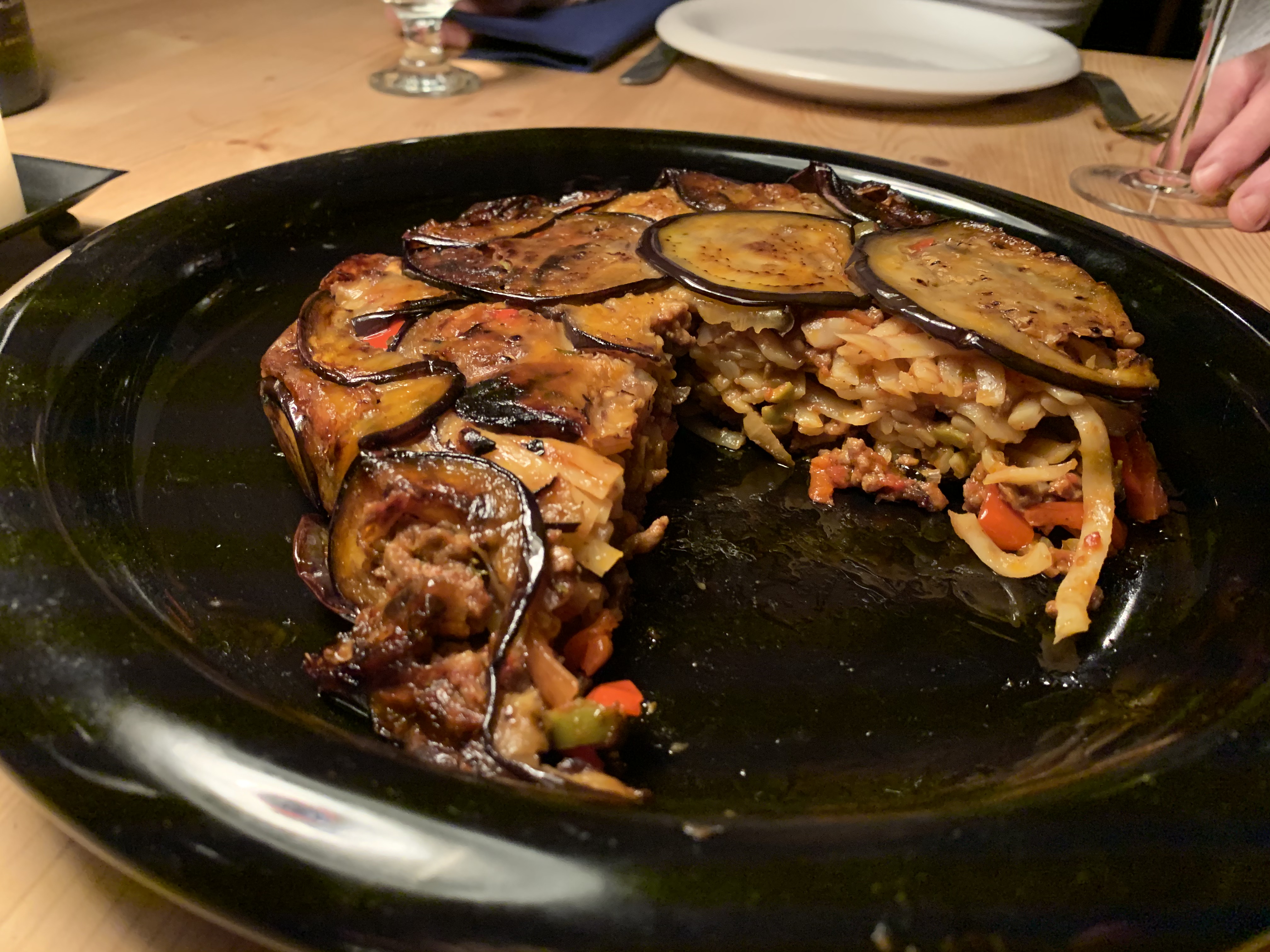 Har ei bok med pastaoppskrifter som sikkert er 20 år gammel. Den blir ofte brukt som inspirasjon. Her kommer en artig, velsmakende og vakker variasjon, hvor aubergin og pasta gir spennende smaker:
