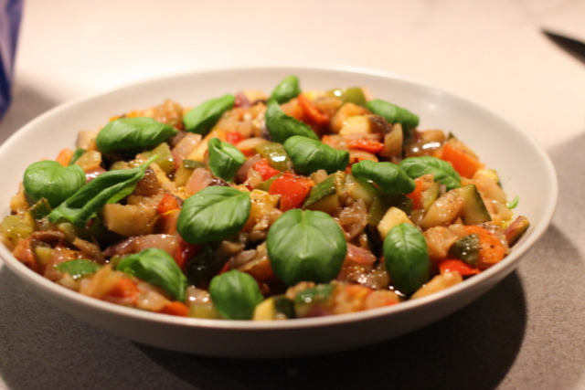 Mange, meg selv inkludert – av og til – lager ratatouille raskt ved å steke opp grønnsaker i panna. Her er ei oppskrift på den ultimate ratatouillen, inspirert av ei kokebok jeg har fra Provence. Den viktigste finessen er å koke ned grønnsakskrafta til en tyktflytende sirup. Det er ikke vanskelig – du trenger bare god tid, vel to timer. da er det greit å lage en stor porsjon, ratatouillen kan brukes til mange retter og som egen liten rett, gjerne kald. Aubergin og squash (zucchini) er hovedingredienesene. Denne oppskriften er basert på to hele (ca 800g) av hver.