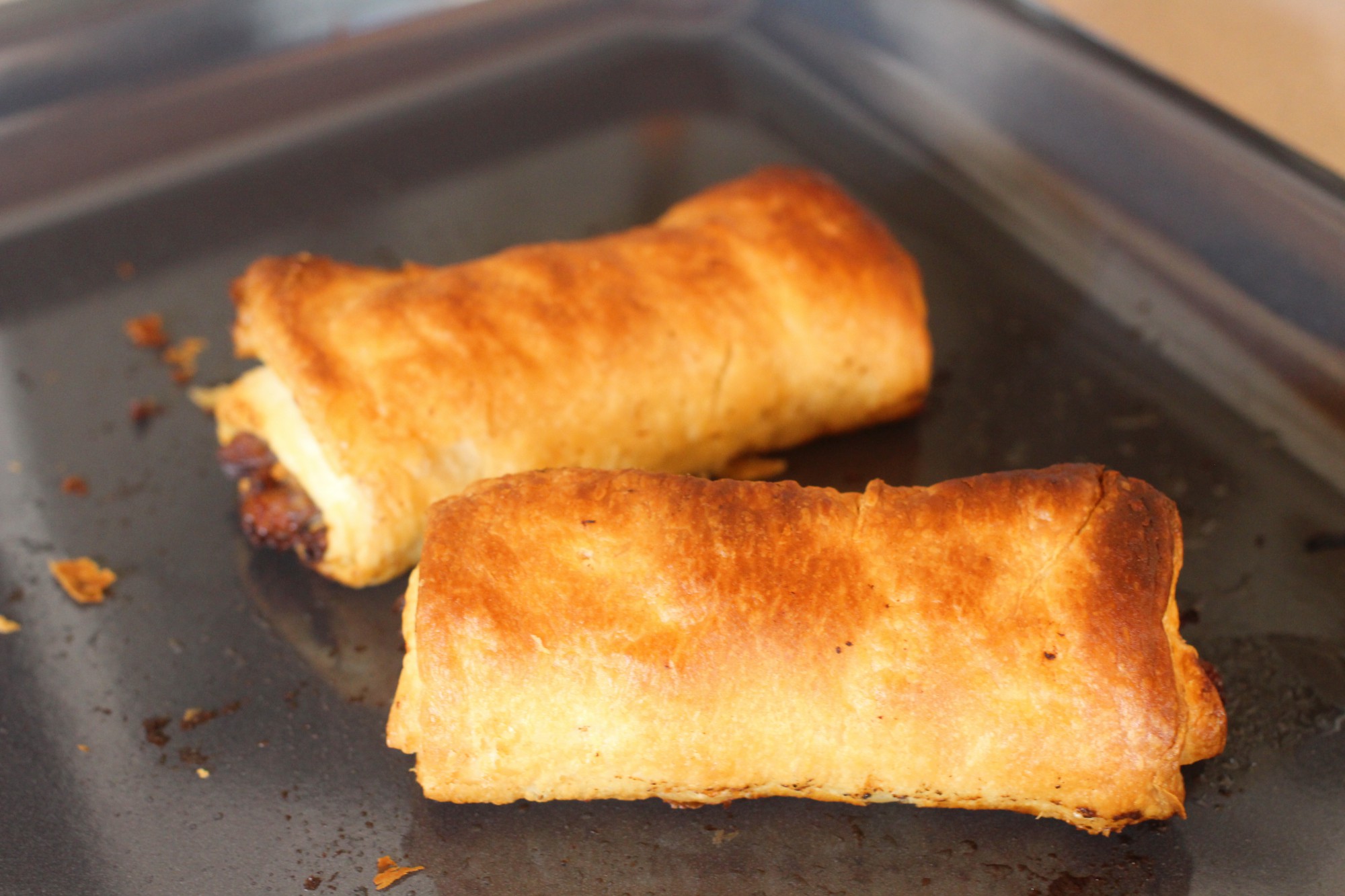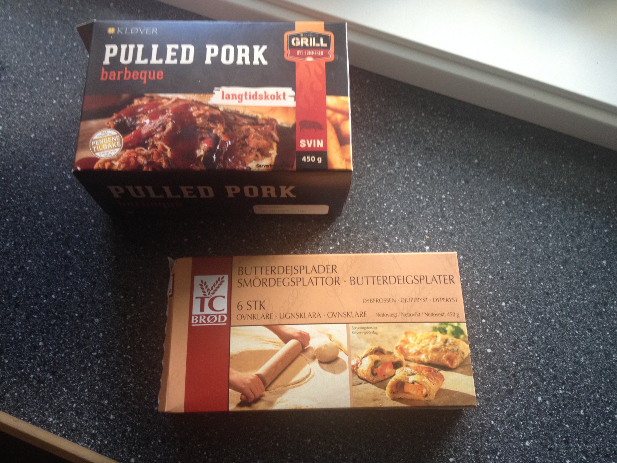 - Pulled pork ble stekt i form med varmluft 180 grader i 25 minutt, som angitt på eska. Fylte rikelig med kjøtt på hver butterdeig og rullet sammen. Butterdeig er jo smør og deig kjevlet sammen, så jeg lurte like