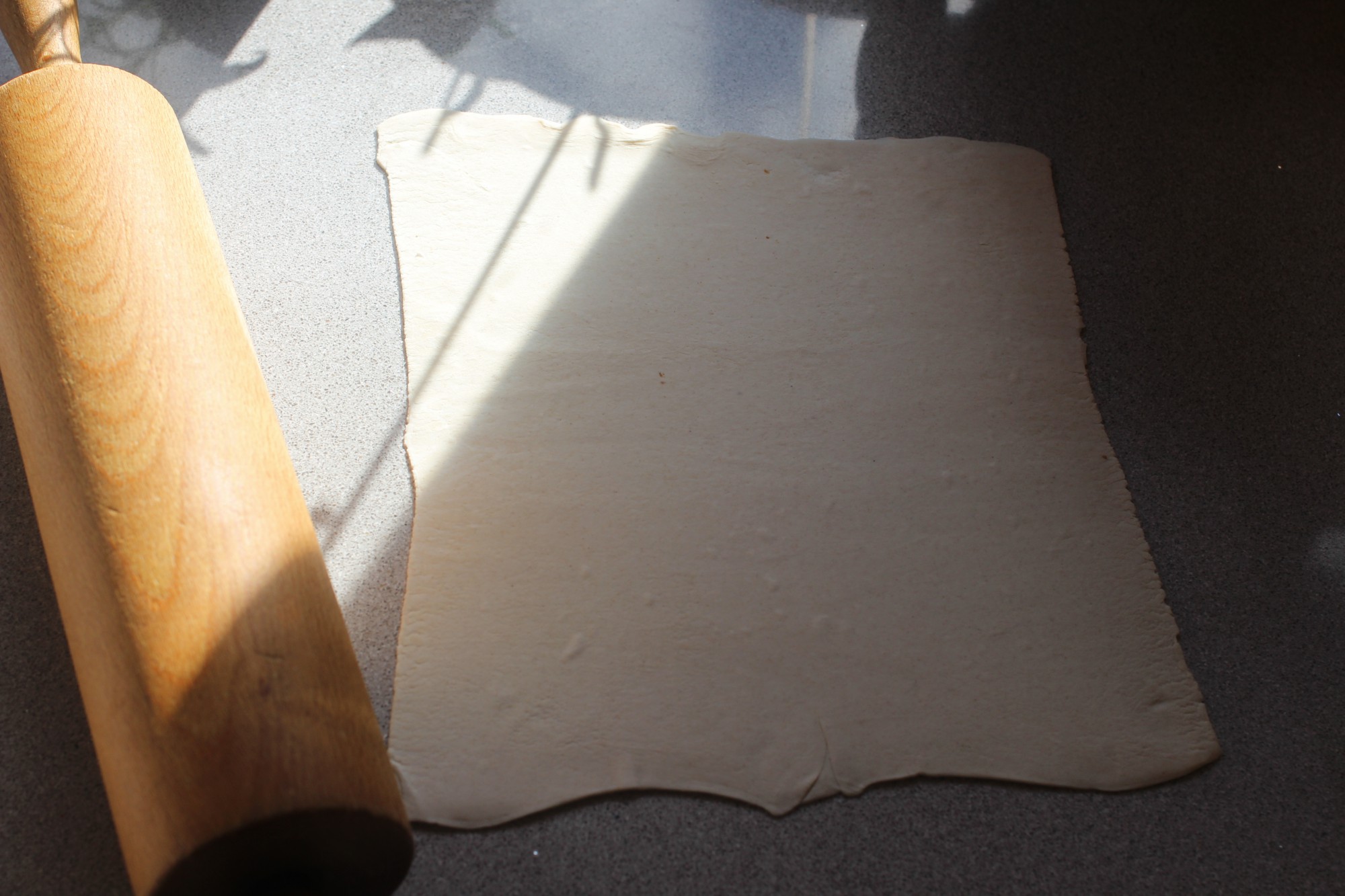 - Ett flak butterdeig kjevlet jeg ut til 1-2 mm tykkelse og delte opp for to «pakker. «