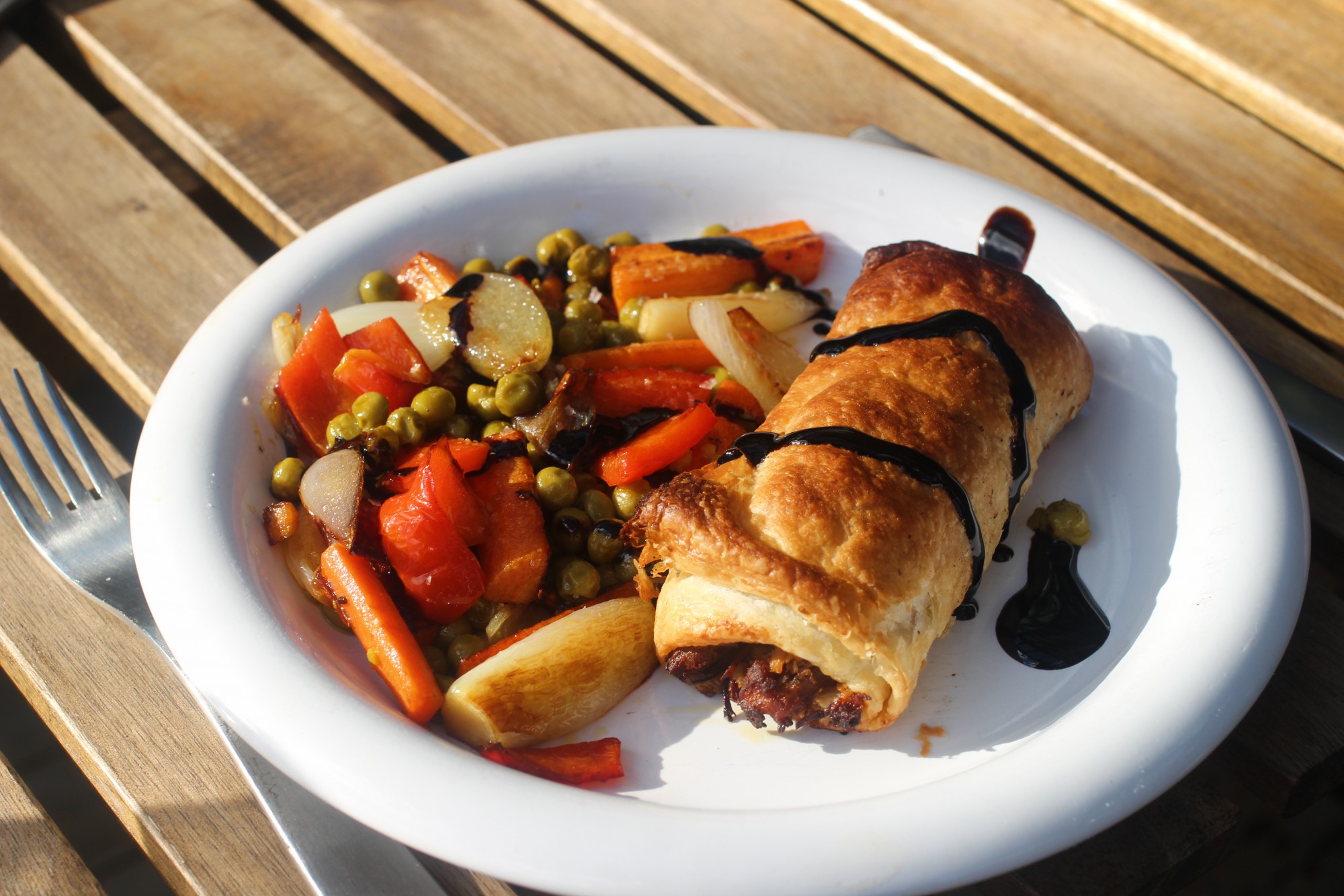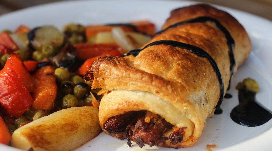 Så jeg satset på den sammen med frosne butterdeigplater – altså fullt og helt halvfabrikata denne gang…. og siden det slett ikke ble verst, så konstaterer jeg at det ble en ganske snarlaget elegant rett. (Den som vil kan jo alternativt både langkoke en skank el. og kjevle butterdeig fra grunnen…. men da blir det noen timer ekstra.)