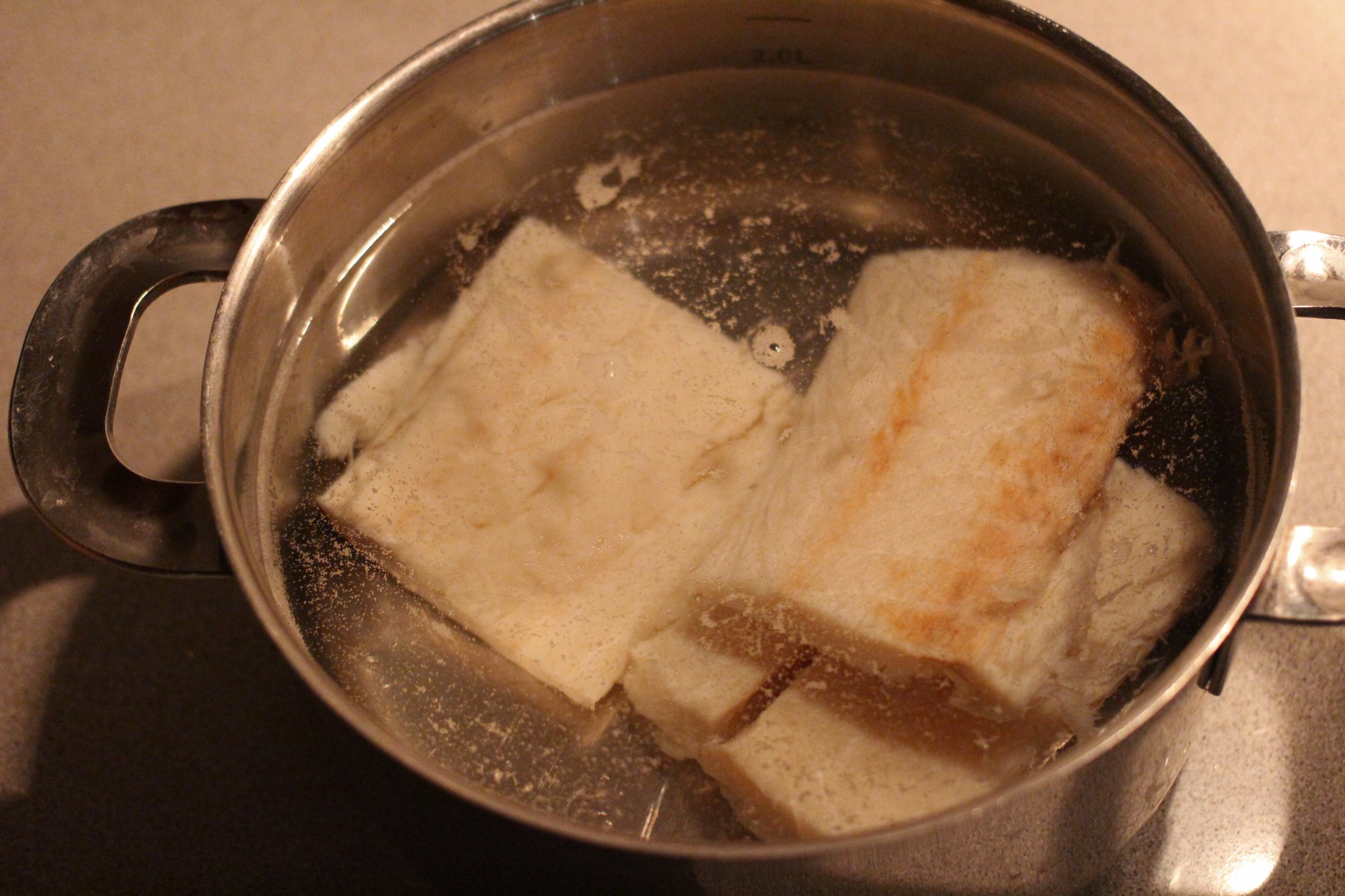 Dette er en klippfiskrett hvor langvarig utvanning er unødvendig. Dermed kan denne forretten ordnes i løpet av en halvtime, med hovedingrediens som kan ligge månedsvis i kjeller/kjøleskap. Greit dersom det oppstår et akkutt behov for en flerretter…. Klippfiskfileten som jeg bruker her ble kjøpt på Rennebumartnan 2015. Der var det klippfiskleverandøren Knut Garshol fra Kristiansund som lærte meg framgangsmåten.