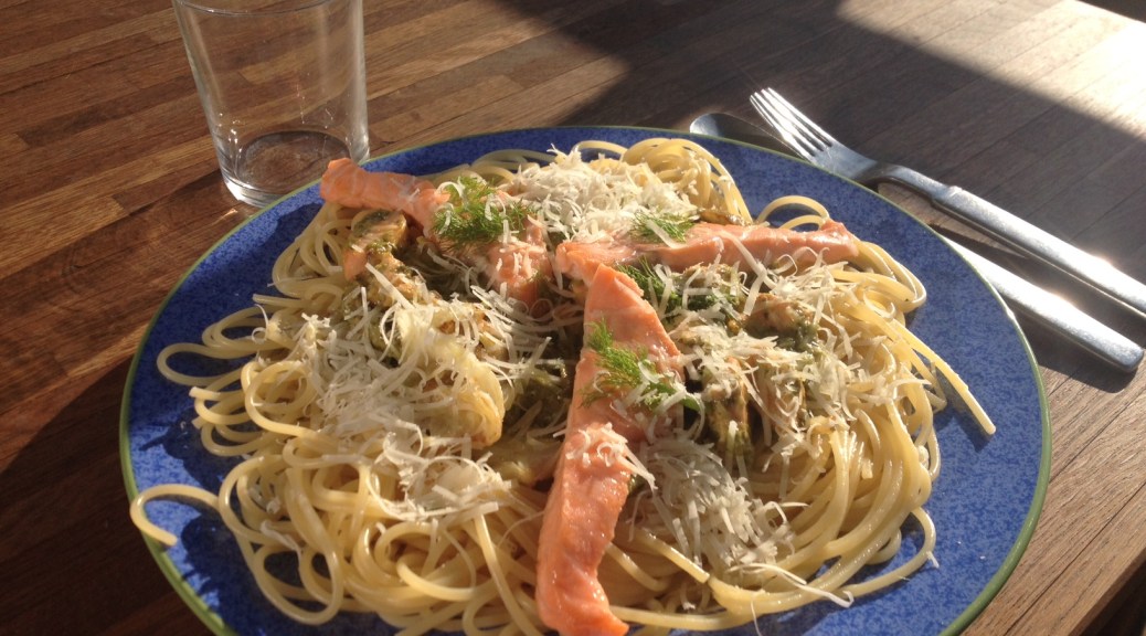 Denne oppskriften har jeg fra søster Siri. De er en god og mettende pasta med laks og pesto, hvor fyllet ordnes like fort som pastaen koker.