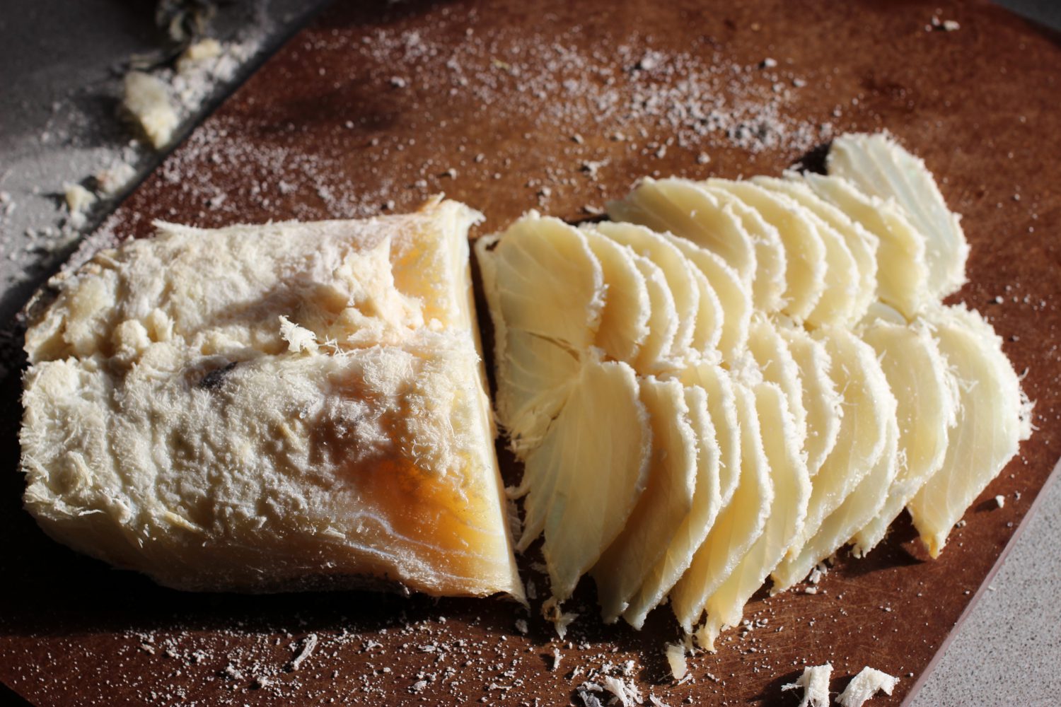 Dette er en klippfiskrett hvor langvarig utvanning er unødvendig. Dermed kan denne forretten ordnes i løpet av en halvtime, med hovedingrediens som kan ligge månedsvis i kjeller/kjøleskap. Greit dersom det oppstår et akkutt behov for en flerretter…. Klippfiskfileten som jeg bruker her ble kjøpt på Rennebumartnan 2015. Der var det klippfiskleverandøren Knut Garshol fra Kristiansund som lærte meg framgangsmåten.